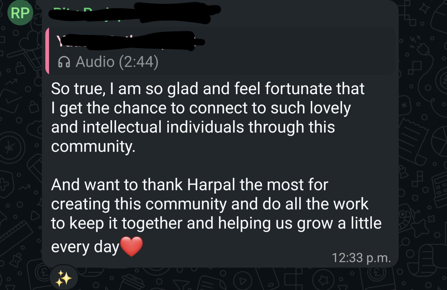 Days turn to weeks and weeks to months, being busy with our routine. But seldom do we take some time off for uplifting ourselves. But I came across this amazing transformation course And there’s so much I'm taking home with. I would like to take a moment to truly thank Harpal and his team for designing and bringing forward this course. Little tasks daily that do not take much of your time but leave a profound impact on you was a treasure for me. It made me realize that it is that little effort you put in every day that takes you a long way. It helped me polish every aspect of my life- be it a five year plan, speaking skills , self introspection or just making new connections, with every task , I unknowingly was working on parts of myself, something I wouldn’t have done otherwise. Cheers to the team and all the love and support to you guys on your journey of bringing change, both within and around you!