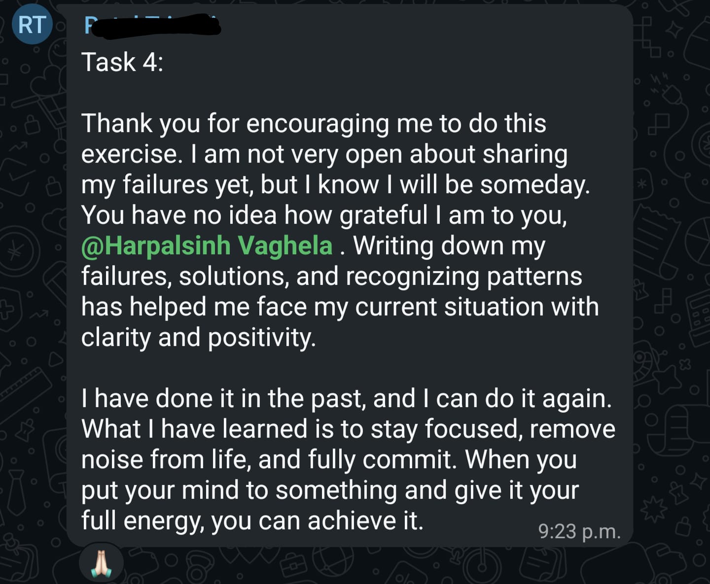 You’ll report all tasks inside the WhatsApp group before the given deadline. That’s where we check and monitor your growth for the next 21 days.