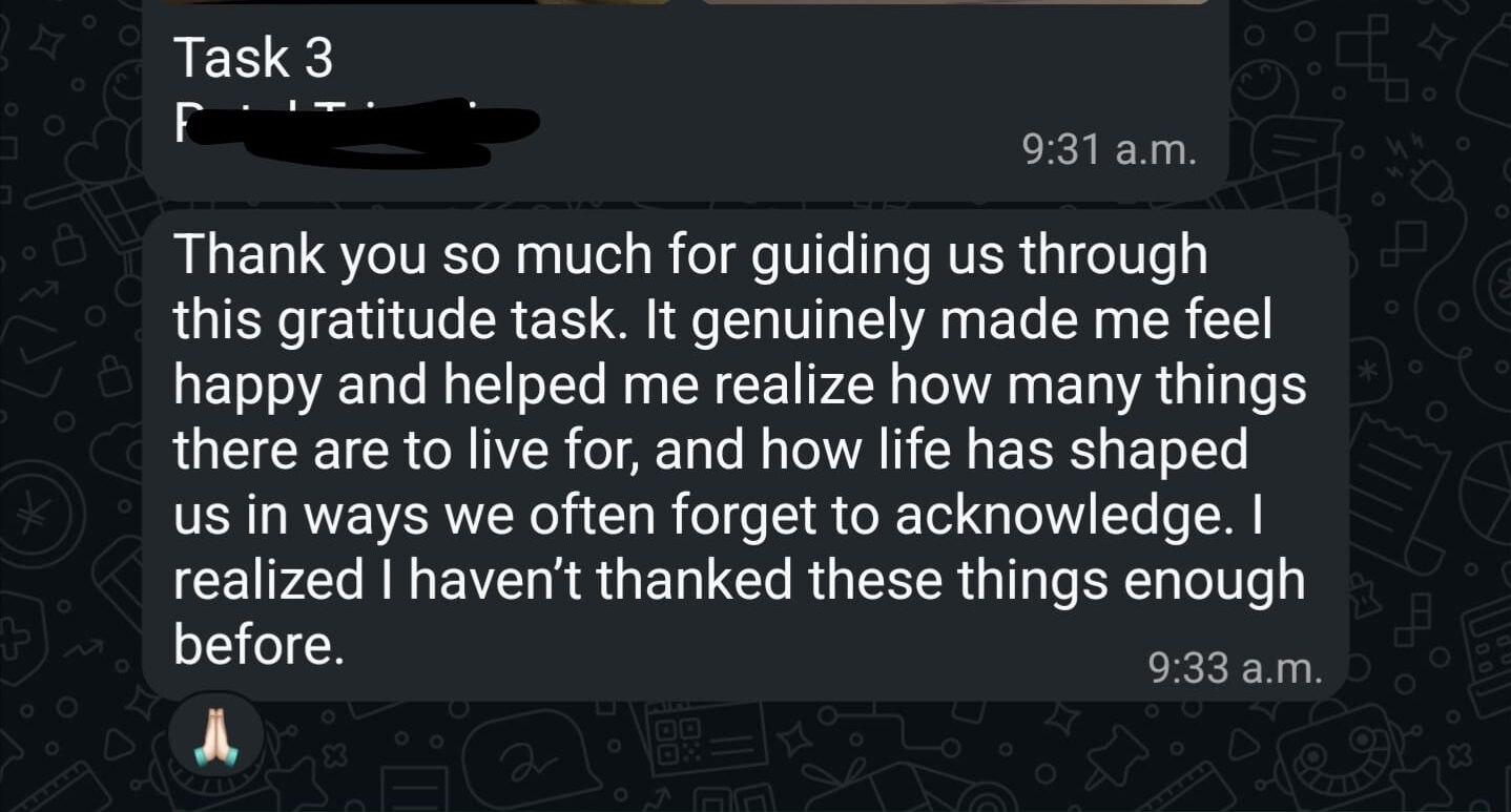 The time of the execution track was incredible for me not just I became punctual but also made a lot of friends , increasing my confidence as well. This program has some interesting tasks which can be surprising and exciting to perform and build a new level of positivity inside you. I would recommend this journey for people who want to develop self confidence and be more positive.